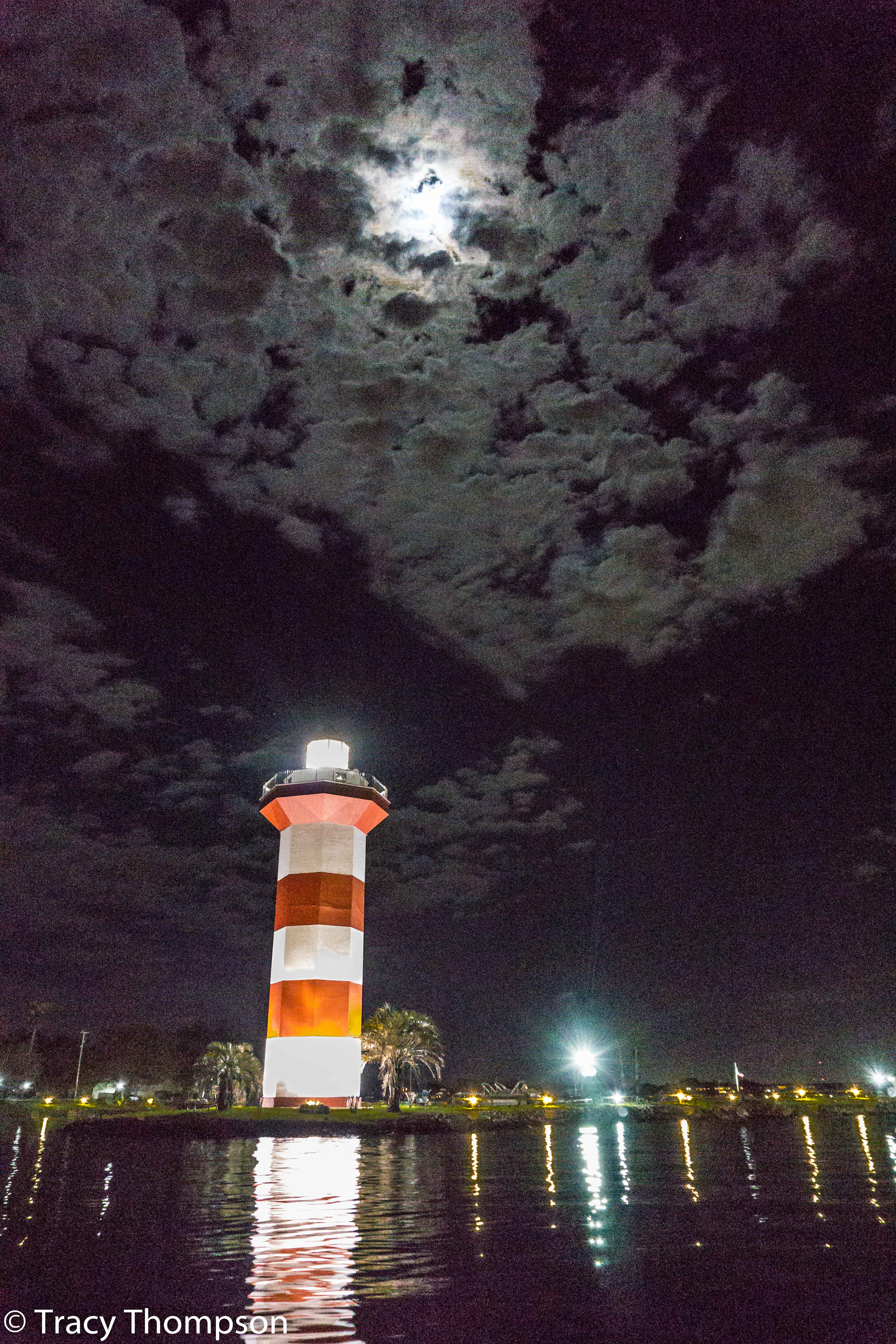 Moon over the lighthouse on lake Conroe, Texas
