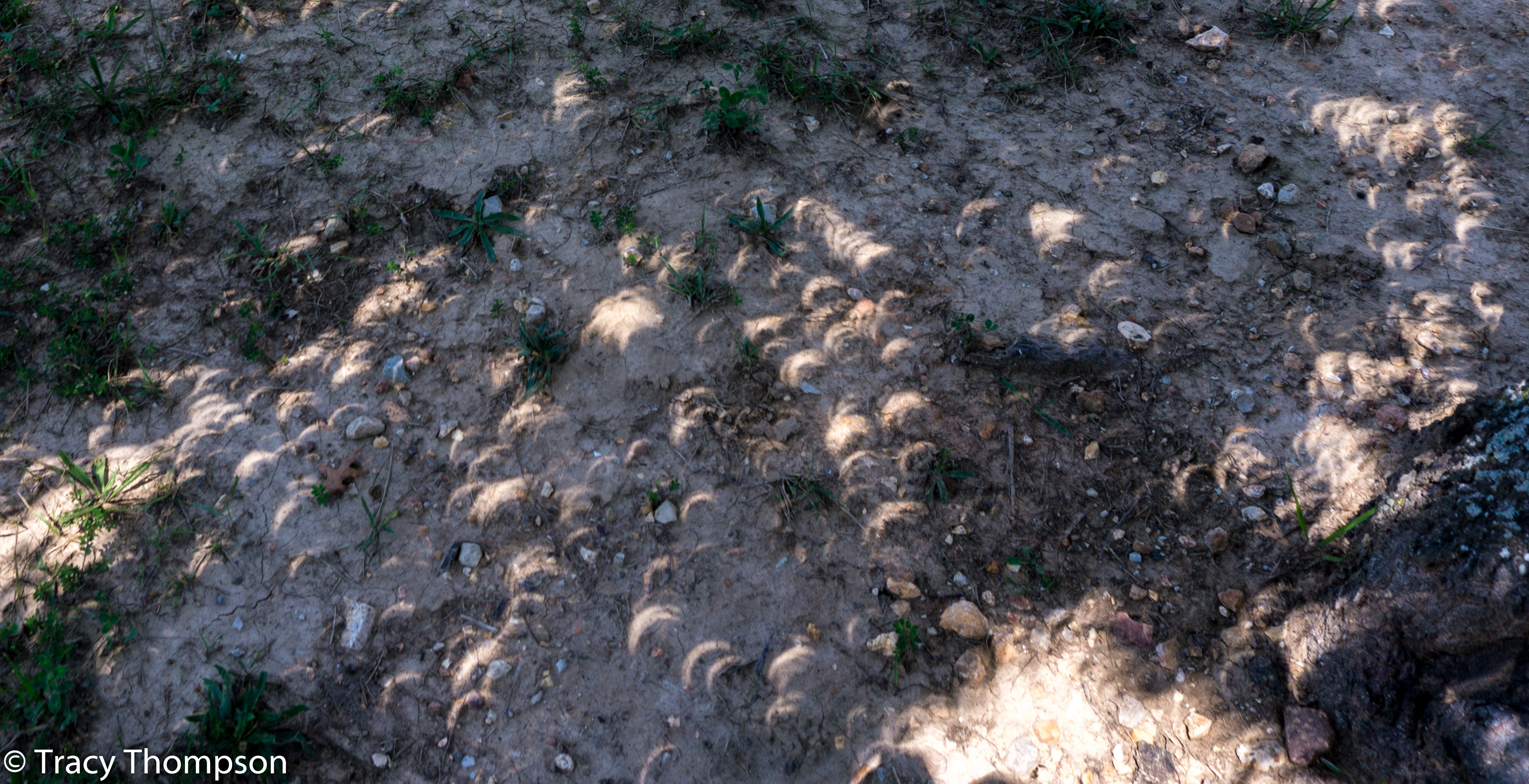 Nearing totality, little crescent arches are seen on the ground, as sunlight passes between the leaves of the trees.
