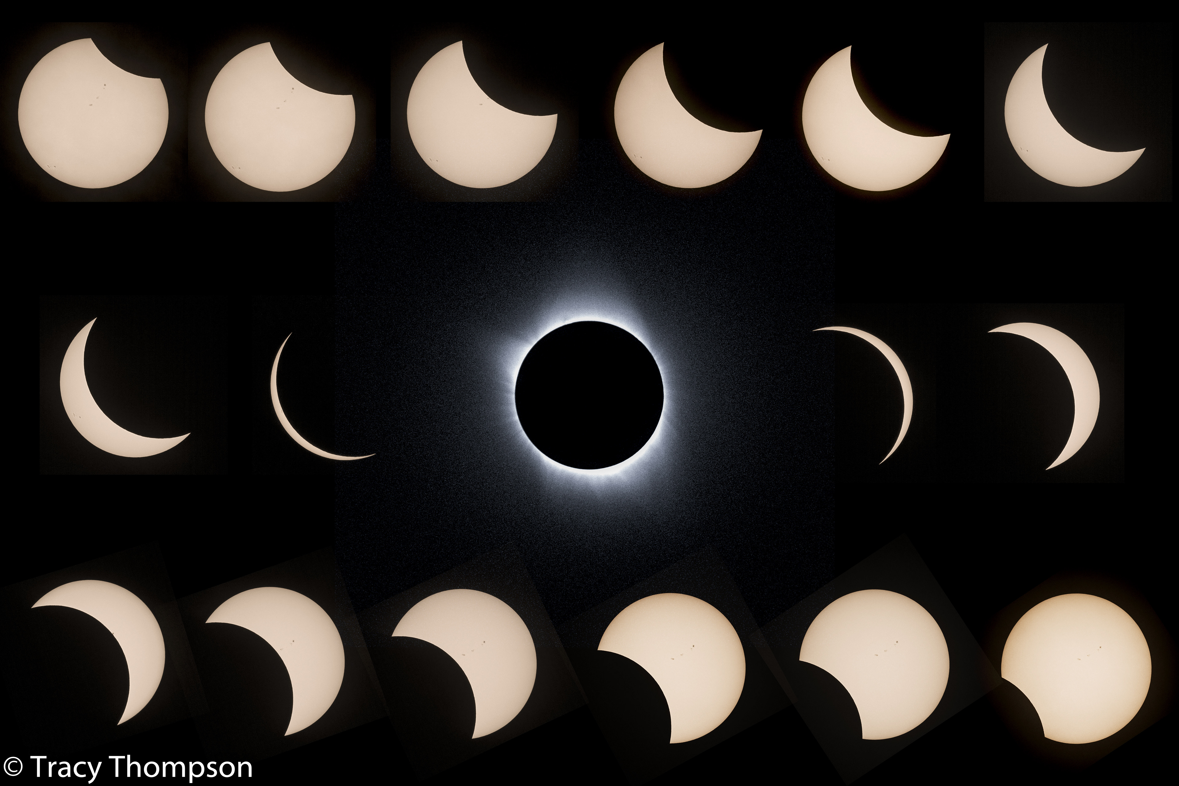 From start to finish of the Solar Eclipse. The Moon approaches the Sun from the top right and starts it march across the Sun. It slowly continues until it completely covers the Sun at totality. A little over two minutes totality quickly ends and the Moon continues it's trek across the face of the Sun.